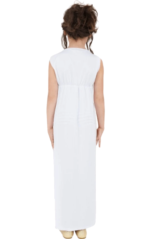 Bring history to life with the Child Grecian Girl Costume! The costume includes a long white and red robe with gold strap detailing and gold headpiece.