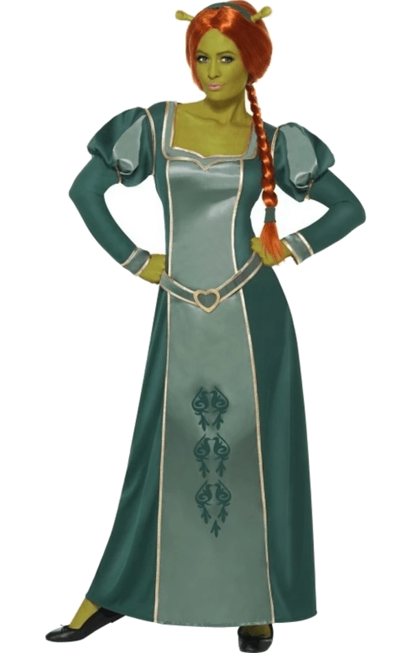 Become a green princess in the licensed Adult Princess Fiona Shrek Costume! This costume includes a long green and gold dress with red wig and headband.