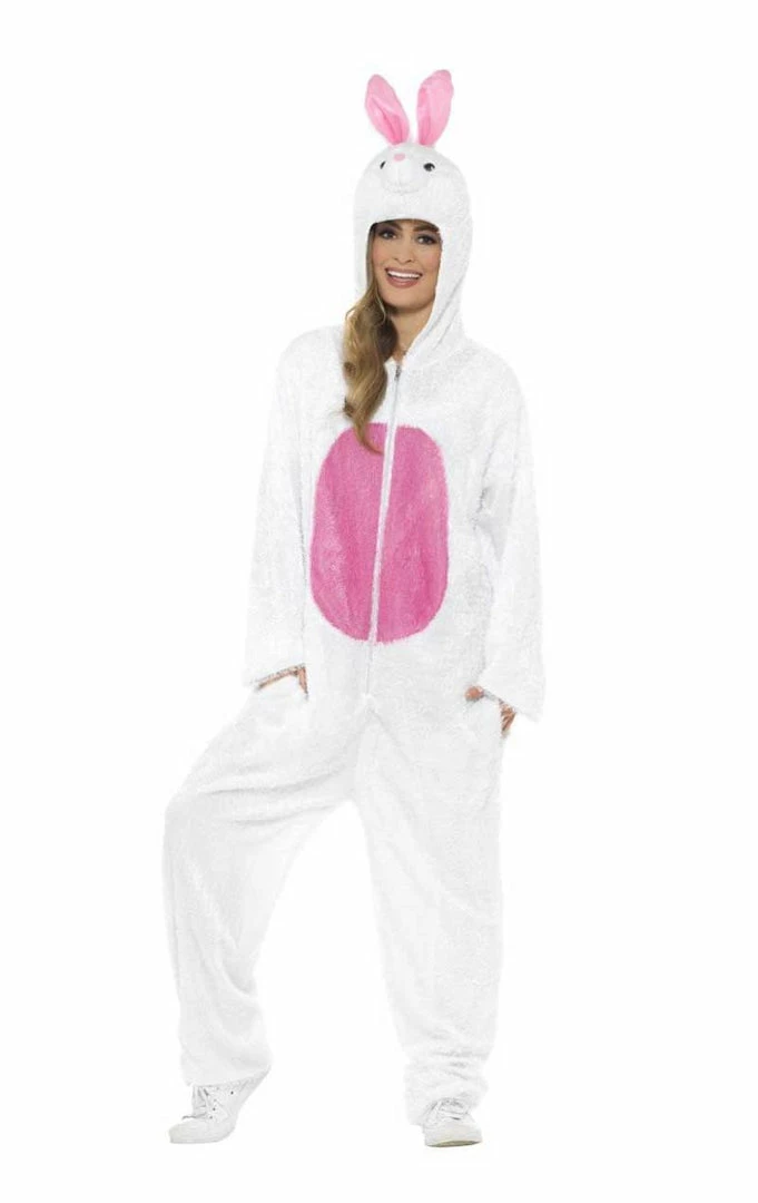 Hop into the party with the Adult Bunny Rabbit Costume! This costume includes a furry white and pink jumpsuit with a hood.