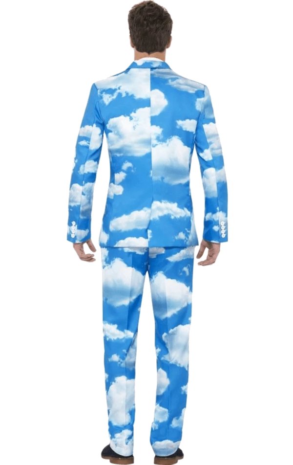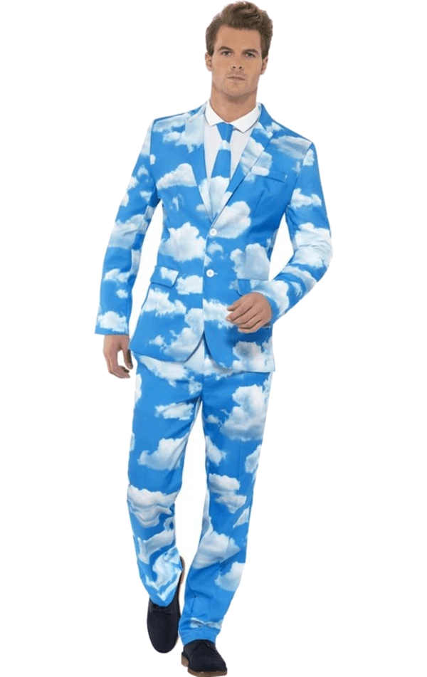 Bring sunny skies with the Adult Sky High Patterned Stand Out Suit! This suit is blue with a white cloud pattern and comes with a jacket, trousers and tie.