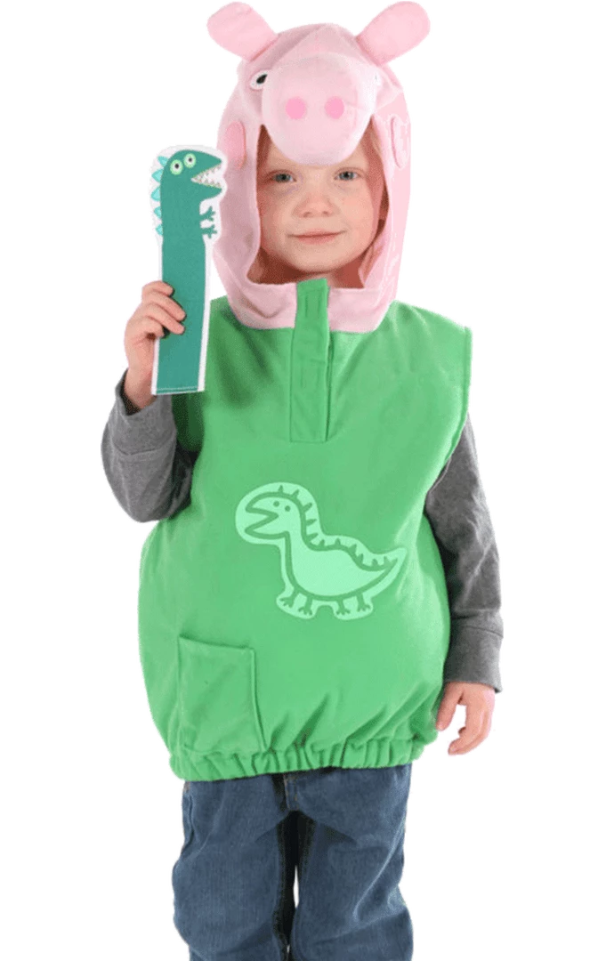 Become your favourite character with the licensed George Dino Pig Dress Up Costume! The costume includes green top with pink hood and 2D felt dinosaur puppet.