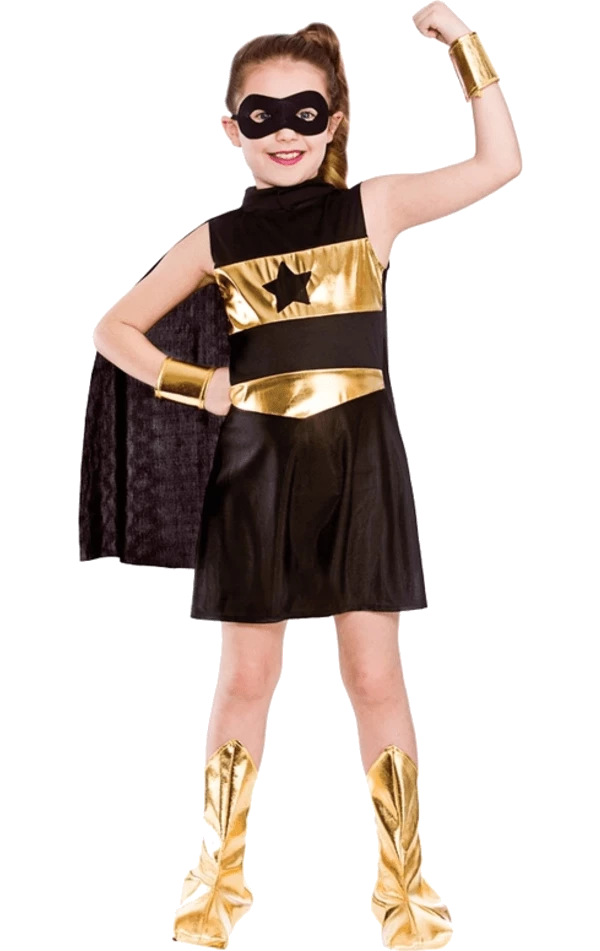 The Child Super Hero Costume Black includes everything she could possible need to fight crime and fly away a hero. The black dress is adorned with metallic gold detailing and sports a star design on the chest. Also included are matching gold wrist and boot covers and the ever-important superhero cape and mask.